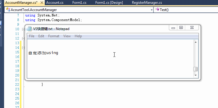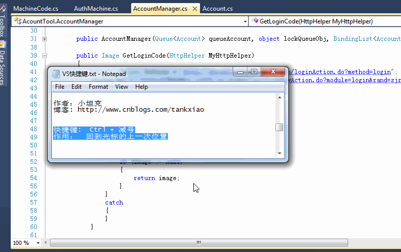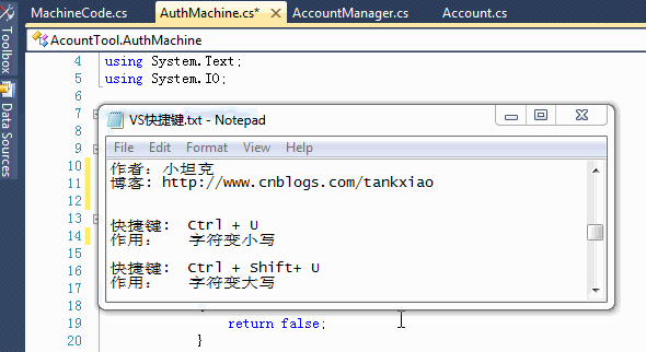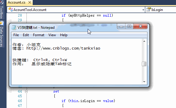 简介: 原文 Visual Studio 常用快捷键 (二) 想不到上一篇 【Visual Studio 常用快捷键】 受这么多人的欢迎。看来大家对Visual Studio的用法非常感兴趣。 接下来我准备写一个 “Visual Studio使用技巧 ” 一个系列的博客。