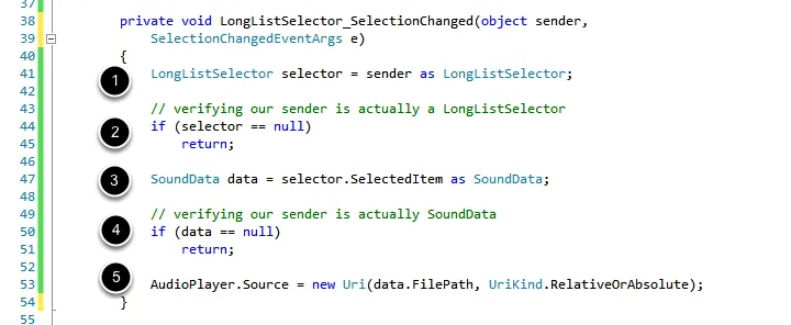 综上所述,本课的重点是如何通过编程的方式处理MediaPlayer元素,做法是设置它的Source属性以动态更改播放的声音。我们学习了"as"关键字,它用于对兼容的引用类型执行转换。在我们的例子中,我们需要将输入属性"object sender"强制转换为LongListSelector以及将SelectedItem转换为DataTemplate 绑定到的类型SoundData。最后,我们学习了如何通过设置SelectedItem属性为空来取消LongListSelector的选中项。