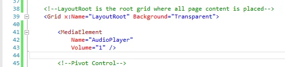 因为每个PivotItem都需要使用MediaElement,我将在靠近代码的顶部位于LayoutRoot Grid控件的下方添加该控件。