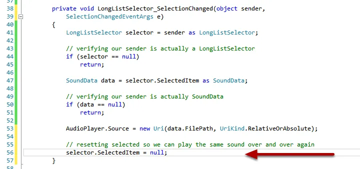 - 同样,我们需要访问被选中的列表项,所以我们访问selector的SelectItem并尝试将它转换为SoundData类型的对象