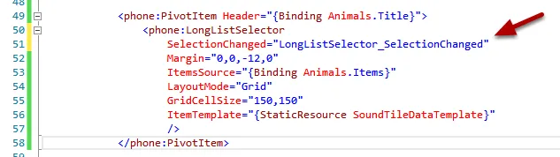 接着我向LongListSelector添加了一个属性,它将在每次磁贴被点击时被触发。我使用了在前面视频中演示的技术来让Visual Studio创建事件处理程序方法的名称和事件处理程序方法的存根。(提示:输入SelectionChanged=",在上下文对话框出现时按Enter键以自动完成代码的其余部分)。代码现在看起来是这样: