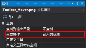 将以上素材另存为,将图片保存在解决方案中Images目录下的ButtonImages文件夹中,并设置图片属性中生成操作选择为“嵌入的资源”。