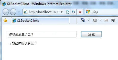 <Grid x:Name="LayoutRoot" Background="White" ShowGridLines="True"> <TextBox Height="23" HorizontalAlignment="Left" Margin="20,20,0,0" Name="tbInput" VerticalAlignment="Top" Width="243" /> <Button Content="发 送" Height="23" HorizontalAlignment="Left" Margin="279,20,0,0" Name="button1" VerticalAlignment="Top" Width="75" Click="button1_Click" /> <sdk:Label Height="28" HorizontalAlignment="Left" Margin="20,57,0,0" Name="lbShowMessage" VerticalAlignment="Top" Width="358" /> </Grid>