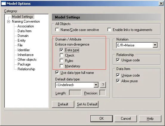 注:设置域与数据项的分离关系,Tools->Model Options ->Model,设置“Domain/Attribute”,Enforce non-divergence 下的Data type(数据类型、长度、精度)、Check(检查约束)、Rules(业务规则)、Mandatory等。如果都不选,则表示设置域与数据项是可分离的。默认为Data type 不可分离,可自行设置。如下图所示