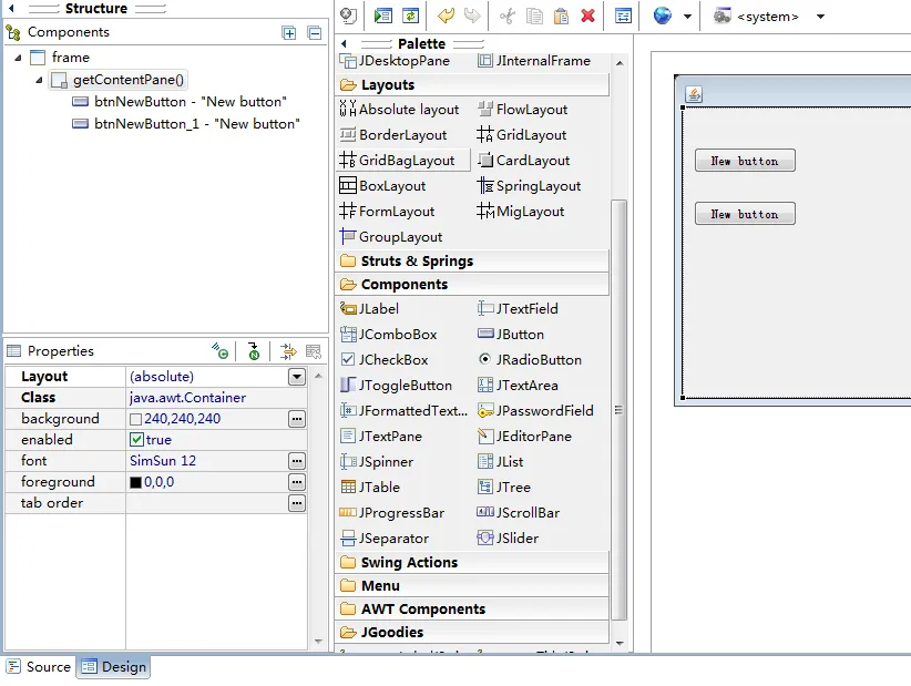 可视化设计器:新建一个可视化JFrame的类(other里windowbuilder下)就行了!