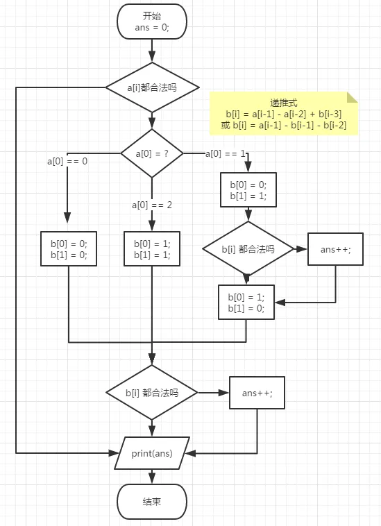 程序流程图如下(这里的“合法”判断与具体位置有关,如a[0], a[n-1] <3, a[n-1] == b[n-1] + b[n-2]):