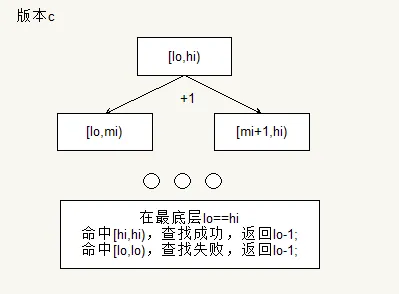 版本c有更多语义上的规定,当查找成功时,若有多个元素与e相等,返回秩最大的那个;当查找失败时,返回应插入的位置,即最后一个小于等于e的元素的秩。