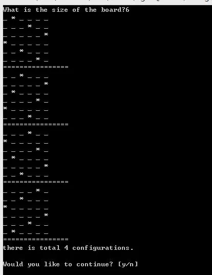 1 int sum = 0;//记录解决方案个数 2 3 int solve_from(Queens &configuration)//通过递归、回溯找到所有解决方案并打印 4 /*Pre: the queens configuration represents a partially completed 5 arrangement of nonattacking queens on a chessboard. 6 Post: all n-queens solutions that extend the given configuration are 7 printed. The configuration is restored to its initial state. 8 Uses: the class Queens and the function solve_from, recursively.*/ 9 { 10 if (configuration.is_solved())//当生成一种解决方案时打印,sum自增一 11 { 12 sum++; 13 configuration.print(); 14 cout <<"================" <<endl; 15 } 16 else 17 for(int col=0; col<configuration.board_size; col++) 18 if(configuration.unguarded(col)) 19 { 20 configuration.insert(col); 21 solve_from(configuration);//recursively continue to add queens当生成一种解决方案时打印 22 configuration.remove(col);//return the last row and the last col.试探上一层的下一种方案(无论上一次试探是成功还是失败) 23 } 24 return sum; 25 }
