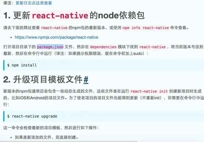 因为是通过npm进行管理的,所以会有一个package.json的文件。这个文件里指定了RN的版本,安装好之后就是最新版本,如果官网版本有更新,那么你这里的版本就会落后了,那么升级的时候就是需要把这个版本号改为最新的版本然后执行npm install.