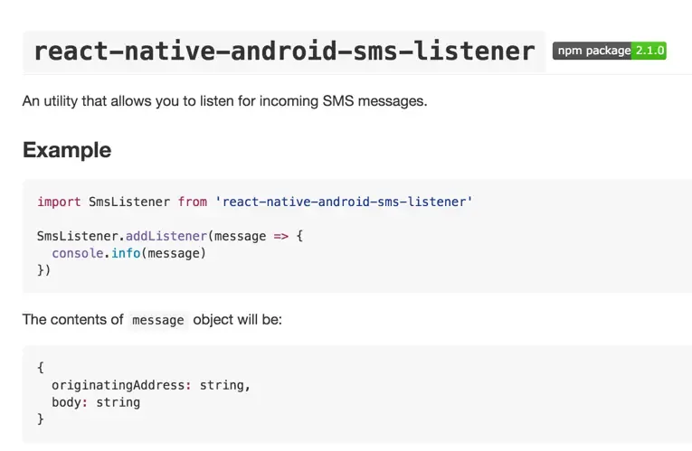 成功找到一个React-native-sms-listener的模块,是一个巴西的开发者开发的。