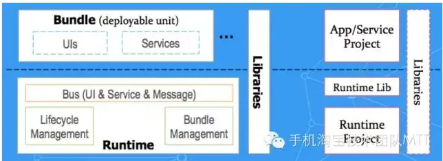 淘宝从2009年开始关注移动端,先后经历了WAP、Mobile Web,到API网关、HTML5容器,以及2014年的容器架构。经历了很长时间的架构治理之路。在2013年淘宝对移动实行ALL IN战略之后,手机淘宝开始反思客户端App架构该如何设计,以及如何应对大量业务同时涌入、超10个团队的代码整合等问题。他们思考的结果就是一切皆组 件(Bundle),Bundle装载在容器里,任一Bundle均可以动态部署,阿里无线终端容器框架(Altas),管理组件生命周期,提供组件运行 必须服务,实现组件间环境隔离、权限控制、运行期性能监控等功能。另外,在基础架构演进、工具体系完善、研发机制变革上,手机淘宝也做了许多工作。