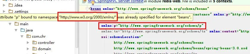 在XML文件头部添加xmlns:p="http://www.springframework.org/schema/p"即可使用。(在Spring之后的版本中,p标签已经包含到namespace "http://www.w3.org/2000/xmlns/"中了)
