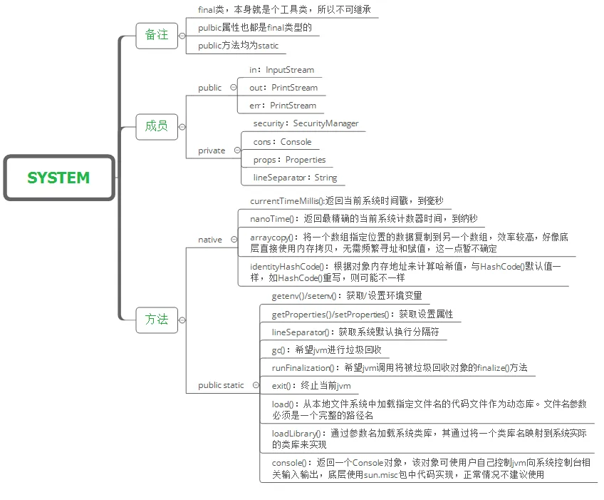 上次面试中遇到的一个问题,问到System.out.println()中的out是不是内部类【不是内部类】,当时就给问蒙了,直观感觉out应该是System类的一个属性,跟内部类有什么关系?而且之前整理IO部分的时候记得有个PrintStream的类用于标准输出的,但是从没看过System的源码,也不敢随便再说了。后来看了下源码,发现的确是PrintStream,可能当时想问的是内部类的用法吧(真心感觉面试待靠缘分,很多面试官喜欢引导着问问题,方式很好,但很多时候可能让面试者搞不清你到底想问什么,我这次面试就深受打击,到最后面试官每个问题我都要先想半天是不是留了什么坑),不过归根结底自己水平差得多,还是要认真学习。 言归正传,System类是jdk提供的一个工具类,有final修饰,不可继承,由名字可以看出来,其中的操作多数和系统相关。其功能主要如下: