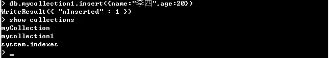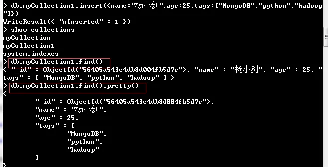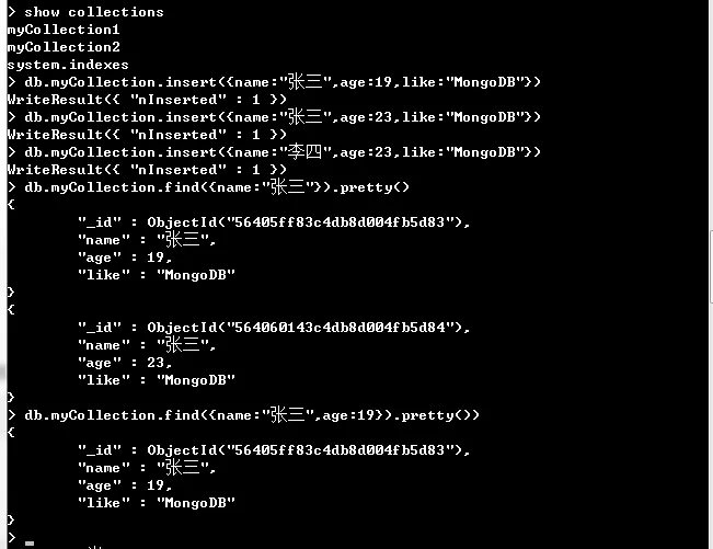 这里 myCollection1是集合的名称。如果集合在数据库中不存在,那么MongoDB 将创建此集合,然后把它插入文档。我们也可以插入数组,道理是一样的,你可以自己试试。