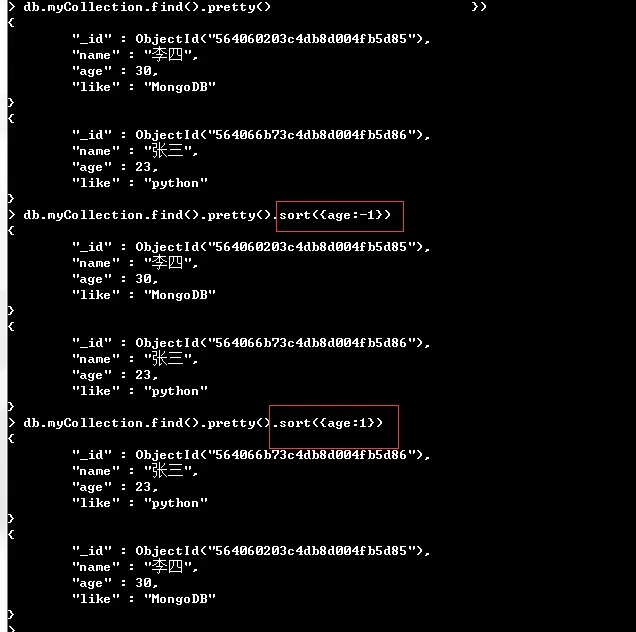sort() 方法 : 接受一个文档,其中包含的字段列表连同他们的排序顺序。要指定排序顺序1和-1。 1用于升序排列,而-1用于降序。请注意,如果不指定排序优先,然后sort() 方法将文档显示在升序排列。
