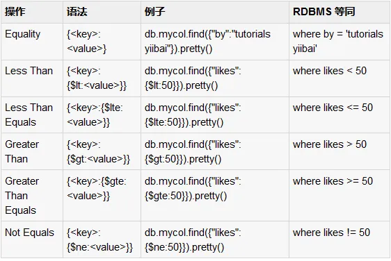 下面做下条件查询:RDBMS Where子句和MongoDB等同语句