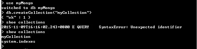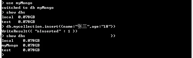 use myMongo (创建的数据库myMongo 列表中是不存在的。要显示的数据库,需要把它插入至少一个文件,如:db.test.insert({name:"张三",age:"18"}))