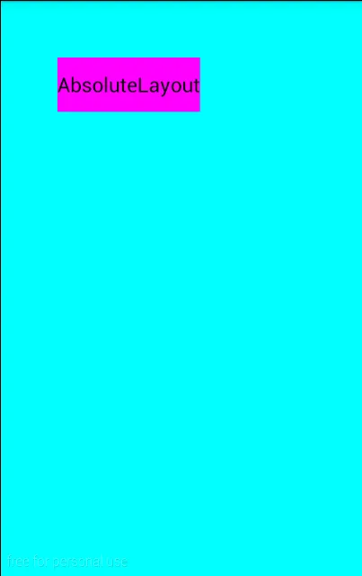 android:layout_width="match_parent" android:layout_height="match_parent" android:background="#00ffff"> <Button android:id="@+id/er" android:layout_width="wrap_content" android:layout_height="wrap_content" android:layout_x="50dp" android:layout_y="50dp" android:background="#ff00ff" android:text="@string/al" /> </AbsoluteLayout>