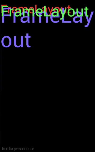 android:layout_width="match_parent" android:layout_height="match_parent" android:background="#000000"> <TextView android:layout_width="wrap_content" android:layout_height="wrap_content" android:text="@string/fl" android:textColor="#ffff2f25" android:textSize="40sp" /> <TextView android:layout_width="wrap_content" android:layout_height="wrap_content" android:text="@string/fl" android:textColor="#ff7e66ff" android:textSize="70sp" /> <TextView android:layout_width="wrap_content" android:layout_height="wrap_content" android:text="@string/fl" android:textColor="#ff5eff4f" android:textSize="50sp" /> </FrameLayout>