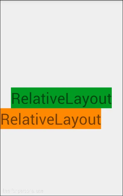 android:layout_width="match_parent" android:layout_height="match_parent"> <TextView android:id="@+id/t1" android:layout_width="wrap_content" android:layout_height="wrap_content" android:layout_centerInParent="true" android:background="#009922" android:text="@string/rl" android:textSize="40sp" /> <TextView android:id="@+id/t2" android:layout_width="wrap_content" android:layout_height="wrap_content" android:layout_below="@+id/t1" android:background="#ff8800" android:text="@string/rl" android:textSize="40sp" /> </RelativeLayout>