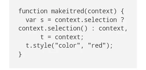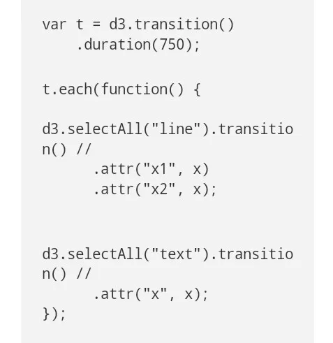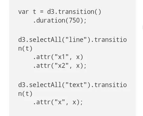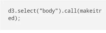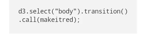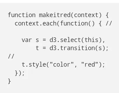 注意到除了去掉转换的魔力,D3逐个转换,新的makeitred功能阻止了转换,逐个完全转变允许你用D3 4.0的新转换写特定选择的编码,这是一个人为的例子,选择并没有被用到,并且t与语境具有一样的价值,因此它并不能降低到原来的原始定义: