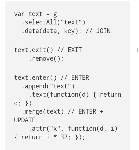 D3 4.0删除了“进入”和“附加”键的魔力。(实际上,D3 4.0删除了“进入”和完全正常选择的区别:现在只有一类选择)在原来的地方,一个新的选择,合并方法使进入和更新选择更统一: