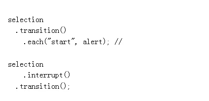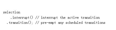 D3的转换是通过系统默认值来达到每个元素的独特性的,如果你需要更大的独特性,这个选择,妨碍被选择元素的积极转换。关于选择的问题,中断D3.3.x 也不能取消决定的被安排在特定的元素的转换。对于这个疏忽没有好的解释——在不同的设计缺陷中有可能会受责备,且他不能外部停止操作。因此,使得取消转换有点困难。(取而代之,先占的转换在开始时就自我结束了。)