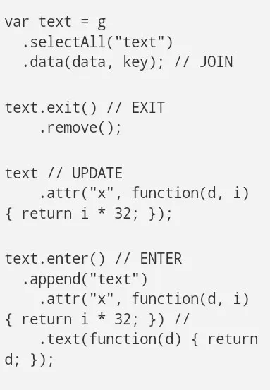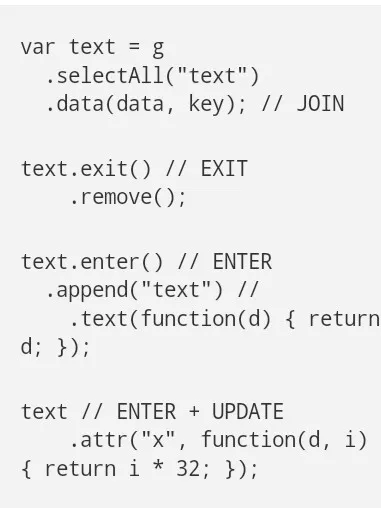 D3 2.0带来了一个改变来解决这类重复:附加“进入”选择现在将复制进入元素到“更新“选择处。因此,任何操作都会应用到“更新”选择在附加“进入”选择应用于进入和更新元素后,并且重复代码可能被消除: