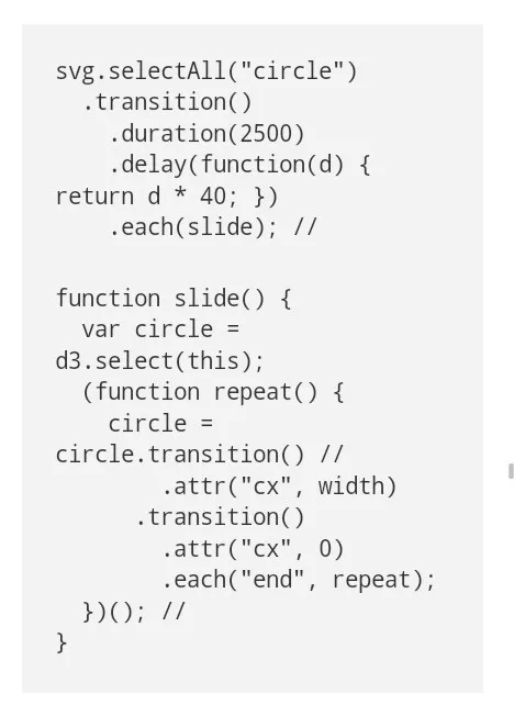 D3没有专有的无限转换序列的方法,但你可以创造一个新的转换,当一个旧的转换结束了听从转换开始或结束事件,这就是我曾经编写过最困惑编码: