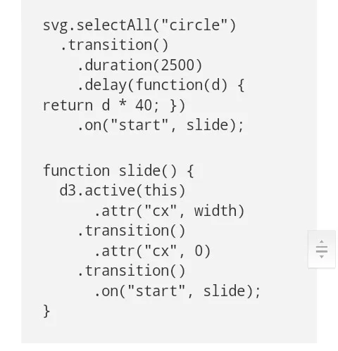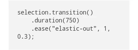 D3 4.0 介绍了D3的活跃成分,在特定元素中返还了积极转换。这个消除了从每一个循环中捕获局部变量的需求(循环变量),延伸到自我调用结束(重复函数功能)的需求,还有每个转换元的需求。真神奇!