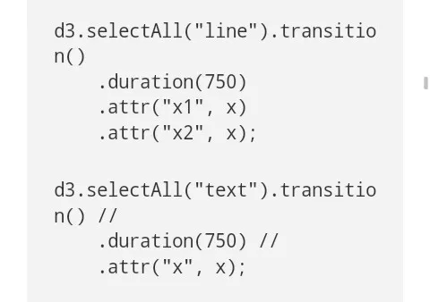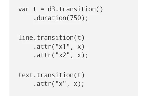 在这里,过渡t在文档根通过选择它们来应用于行和文本元素。这是个优质的,但有限的方案,过渡仅适用于新的选择,而不是现存的选择。重选是可能发生的,但这是不必要的工作(尤其是对瞬时进入、更新和退出重回数据聚合的选择)。