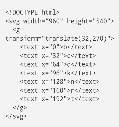 这恰好是一个HTML(超文本标记语言)文档包含一个SVG(可伸缩向量图形)元素,但你并不需要知道每个元素并掌握其概念,只要知道每个元素,例如<文本>…….<文本>一段文本,是一种分离的图形标志。元素被按照等级分组(<svg>包含<g>,其中包含文本,等等)因此你可以定位还可以使每个元素个性化。