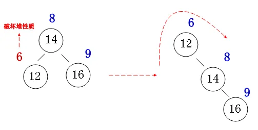 从图中可以看出,当我们插入“节点12”的时候,此时“堆性质”遭到破坏,必须进行旋转,我们发现优先级是6<9,所以就要进行