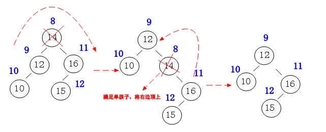 第二种:将”结点下旋“,直到该节点不是”满孩子的情况“,该赋null的赋null,该将孩子结点顶上的就顶上,如下图: