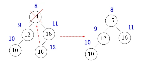 第一种:跟普通的二叉查找树一样,找到“右子树”的最左结点(15),拷贝元素的值,但不拷贝元素的优先级,然后在右子树中