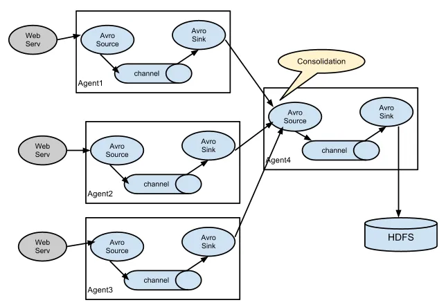 可以将多个Agent顺序连接起来,将最初的数据源经过收集,存储到最终的存储系统中。这是最简单的情况,一般情况下,应该控制这种顺序连接的Agent的数量,因为数据流经的路径变长了,如果不考虑failover的话,出现故障将影响整个Flow上的Agent收集服务。