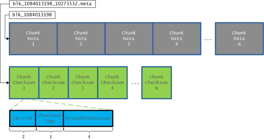 每个Block文件(如上图中blk_1084013198文件)都对应一个meta文件(如上图中blk_1084013198_10273532.meta文件),Block文件是一个一个Chunk的二进制数据(每个Chunk的大小是512字节),而meta文件是与每一个Chunk对应的Checksum数据,是序列化形式存储。