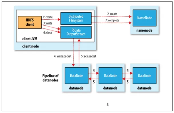 HDFS是一个分布式文件系统,在HDFS上写文件的过程与我们平时使用的单机文件系统非常不同,从宏观上来看,在HDFS文件系统上创建并写一个文件,流程如下图(来自《Hadoop:The Definitive Guide》一书)所示:
