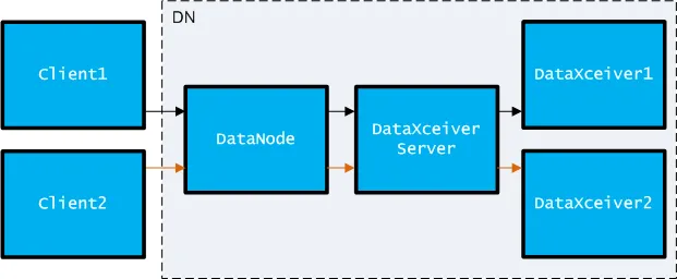 数据最终会发送到DataNode节点上,在一个DataNode上,数据在各个组件之间流动,流程如下图所示: