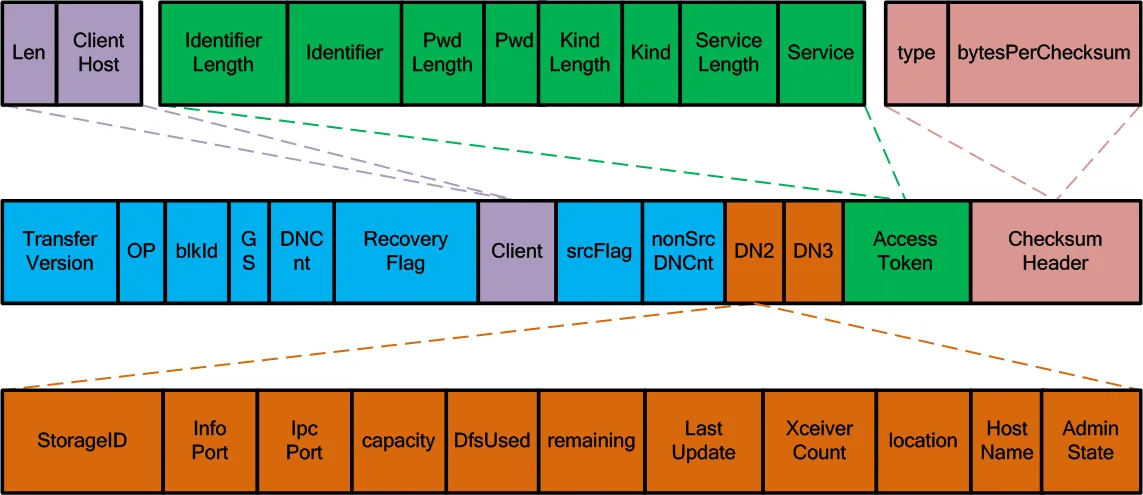 上图显示的是Client发送Packet到第一个DataNode节点的Header数据结构,主要包括待发送的Packet所在的Block(先向NameNode分配Block ID等信息)的相关信息、Pipeline中另外2个DataNode的信息、访问令牌(Access Token)和校验和信息,Header中各个字段及其类型,详见下表: