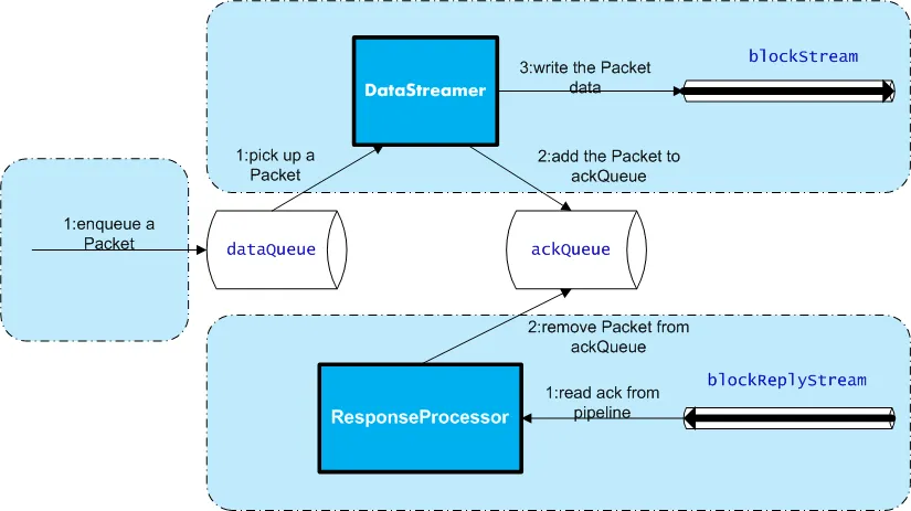 当Client写入的字节流数据达到一个Packet的长度,这个Packet会被构建出来,然后会被放到队列dataQueue中,接着DataStreamer线程会不断地从dataQueue队列中取出Packet,发送到复制Pipeline中的第一个DataNode上,并将该Packet从dataQueue队列中移到ackQueue队列中。ResponseProcessor线程接收从Datanode发送过来的ack,如果是一个成功的ack,表示复制Pipeline中的所有Datanode都已经接收到这个Packet,ResponseProcessor线程将packet从队列ackQueue中删除。