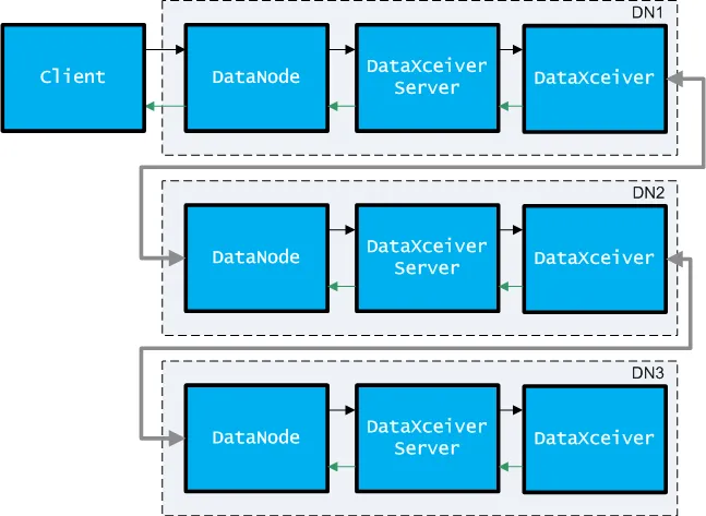 DataNode服务中创建一个后台线程DataXceiverServer,它是一个SocketServer,用来接收来自Client(或者DataNode Pipeline中的非最后一个DataNode节点)的写数据请求,然后在DataXceiverServer中将连接过来的Socket直接派发给一个独立的后台线程DataXceiver进行处理。所以,Client写数据时连接一个DataNode Pipeline的结构,实际流程如图所示: