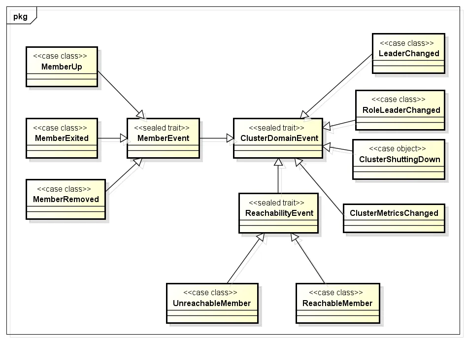 节点状态发生转移会触发某个事件,我们可以根据不同类型的事件来进行相应的处理,为了能够详细捕获到各种事件,我们先看一下Akka定义的事件集合,如图所示: