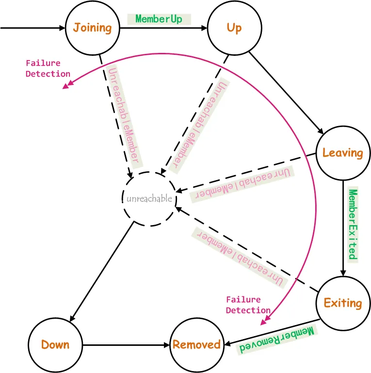Akka集群中的每个成员节点,都有可能处于上面的一种状态,在发生某些事件以后,会发生状态转移。需要注意的是,除了Down和Removed状态以外,节点处于其它任何一个状态时都有可能变成Down状态,即节点故障而无法提供服务,而在变成Down状态之前有一个虚拟的Unreachable状态,因为在Gossip收敛过程中,是无法到达或者经由Unreachable状态的节点,这个状态是由Akka实现的故障探测器(Failure Detector)来检测到的。处于Down状态的节点如果想要再次加入Akka集群,需要重新启动,并进入Joining状态,然后才能进行后续状态的转移变化。Akka集群成员节点状态及其转移情况,如下图所示: