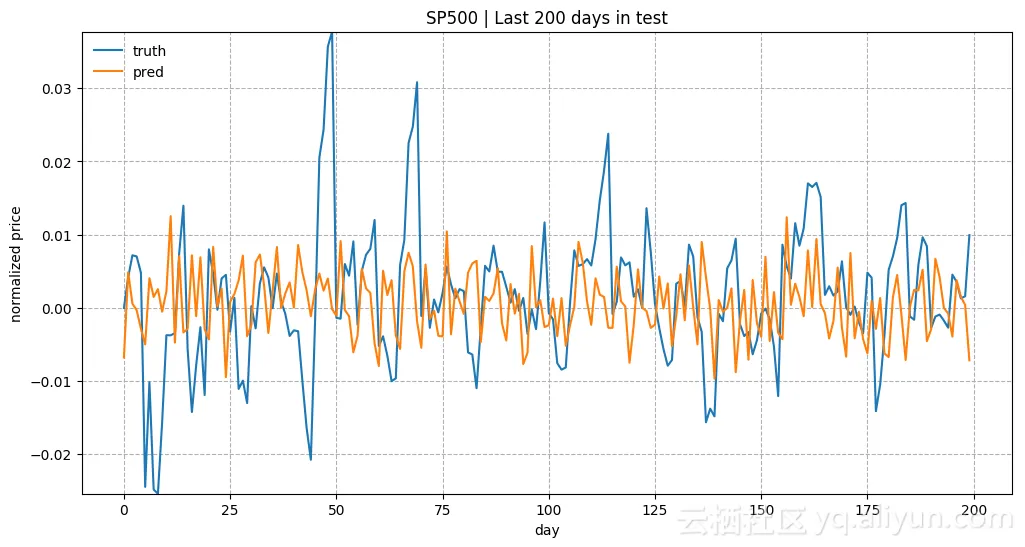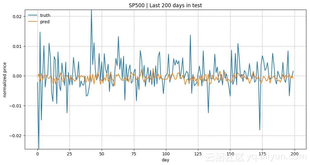 上图是在测试数据中最近200天的预测结果。模型使用input_size = 1和lstm_size = 128进行训练。