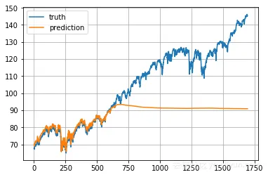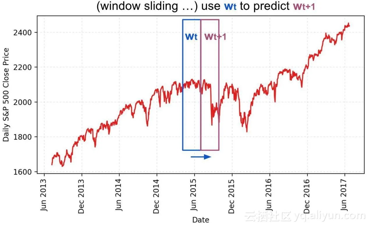 上图为标准普尔500价格。我们在一个滑动窗口中使用内容来预测下一个,而在两个连续的窗口之间没有重叠。
