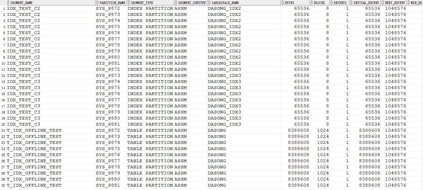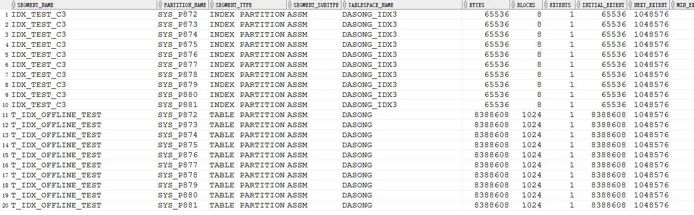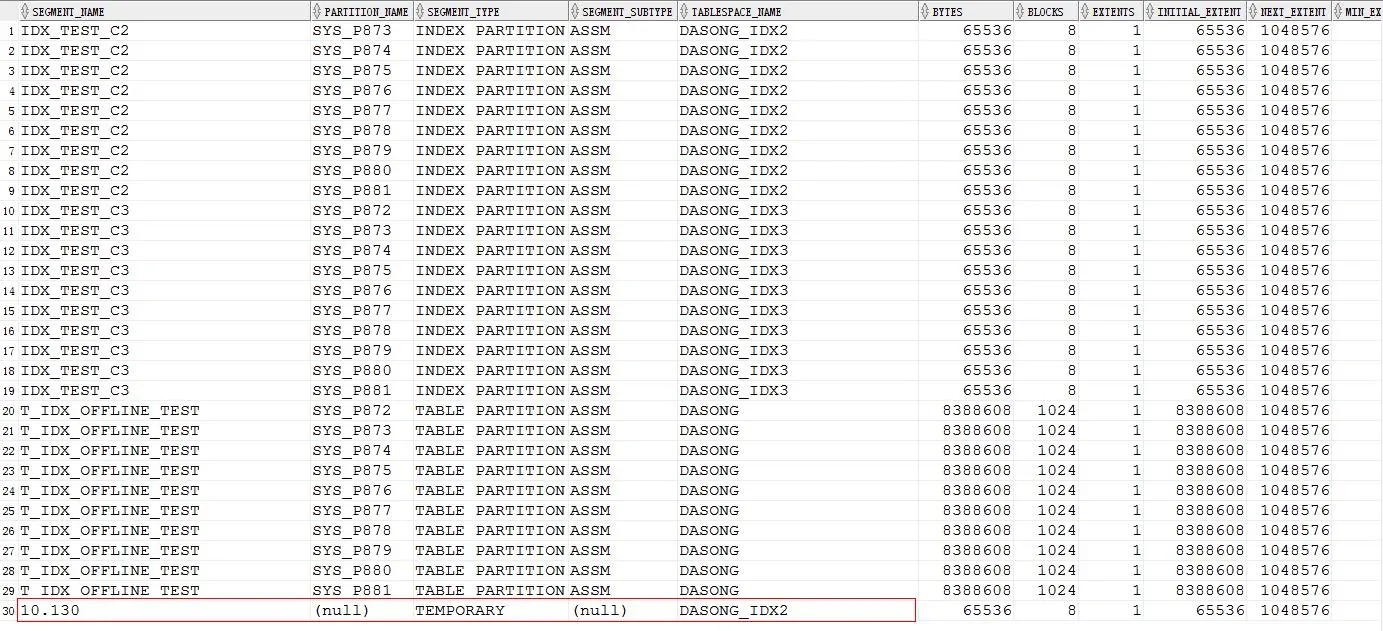 对应的新段在dasong_idx3表空间中,原来的10.130并不没有消失(即使将数据文件online,重启数据库,10.130也不会消失)