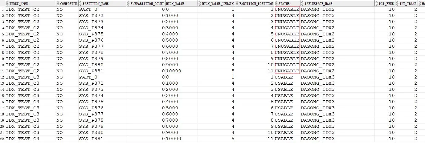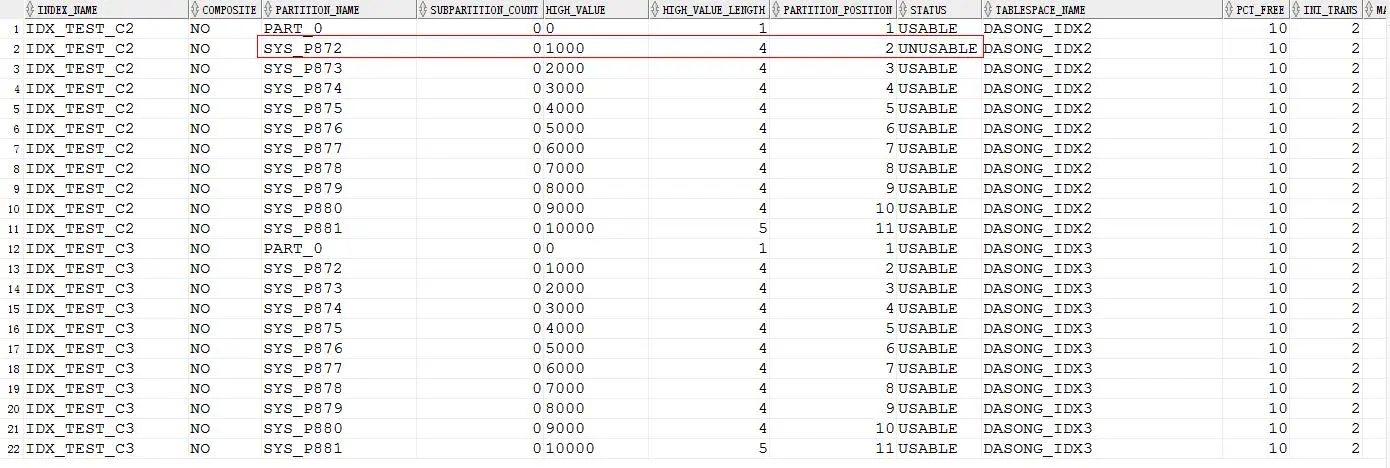 - alter index idx_test_c2 modify partition sys_p872 unusable;