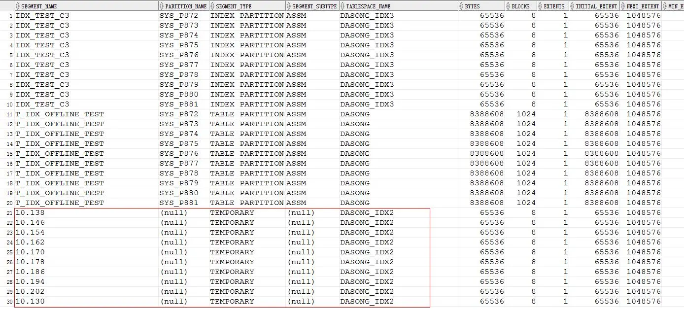所有使用索引unusable的操作都会使 索引原来的分区段变成temporary (unusable索引、删除索引、exchange索引分区对应的数据分区 等);除非删除表空间,其它常规手段都不会删除temporary段(其实此时索引对应的段应该是已经没有了,或是访问不到的,因为数据文件不可用,此时看到的只是元数据)