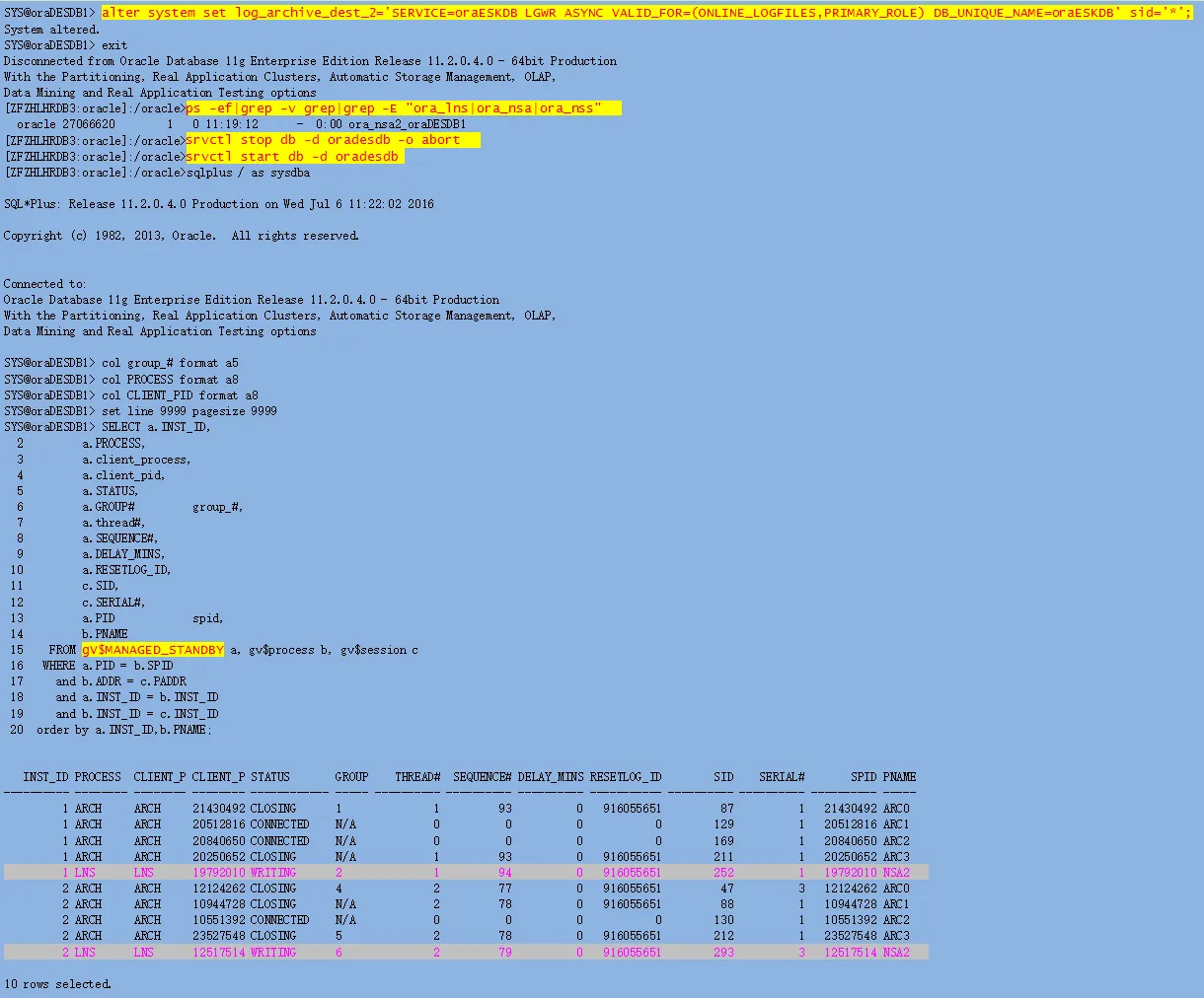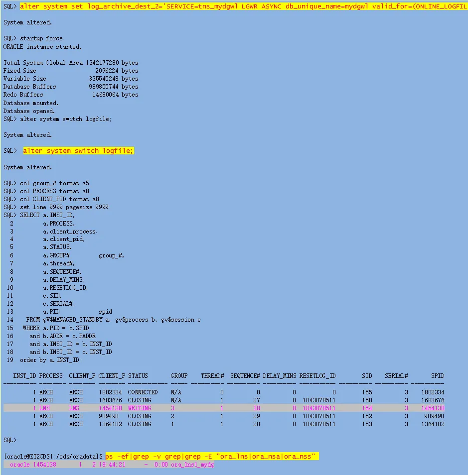 同事说dg不能同步,让我帮忙看看,我用自己写的2个视图查看了下,首先发现主库没有常见的LNSn进程,下意识的认为主库这个进程没有启动,需要切换日志唤醒LNSn进程,事实上也这样做了,(alter system set log_archive_dest_state_2='defer'; alter system switch logfile; alter system set log_archive_dest_state_2='enable'; alter system switch logfile;),切换后发现日志可以正常传输了,但是主库还是看不到LNSn这个进程,于是找找资料,深入的研究了一下这个问题。